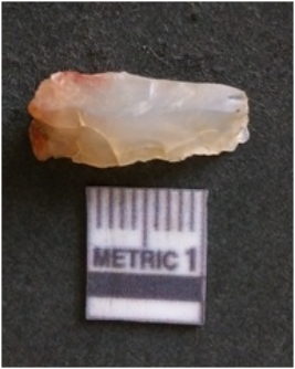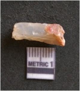 | Description / विवरण | The chalcedony flake is pale in color and translucent in appearance. The piece has s harp flaked ends and a bulbous end due to flaking. The flake has a crypto-crystalline silica matrix. |
