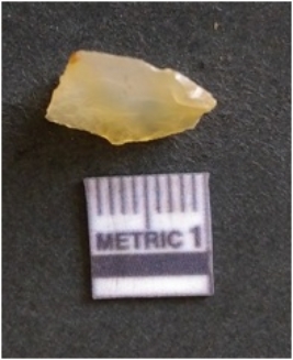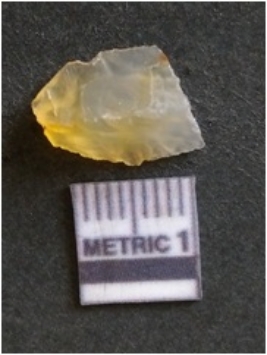 | Description / विवरण | The chalcedony flake is pale in color and translucent in appearance. The piece has s harp flaked ends and a bulbous end due to flaking. The flake has a crypto-crystalline silica matrix. |