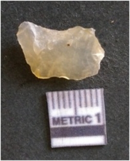 | Description / विवरण | The chalcedony flake is pale in color and translucent in appearance. The piece has s harp flaked ends and a bulbous end due to flaking. The flake has a crypto-crystalline silica matrix. |