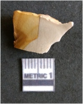 | Description / विवरण | The chert flake has a clear striking platform and ripple marks on the surface as a result of flaking. The piece is smooth, with regular fracture pattern and matt finish on the surface with a prominent bulb of percussion nd sharp flaked edges. |