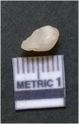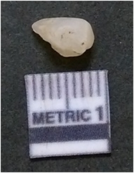 | Description / विवरण | The flake has irregular fracture pattern and sharp flaked edges as a result of lithic knapping activity. The piece is pale, with surface flake scars and a bulbous end. The quartz flake is glassy, and transparent. |