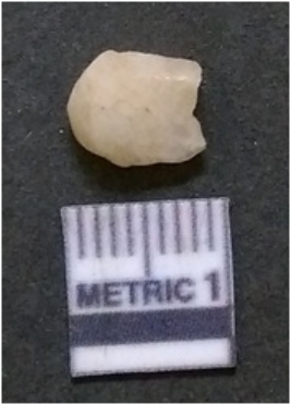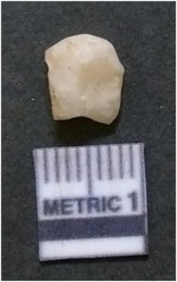 | Description / विवरण | The flake has irregular fracture pattern and sharp flaked edges as a result of lithic knapping activity. The piece is pale, with surface flake scars and a bulbous end. The quartz flake is glassy, and transparent. |