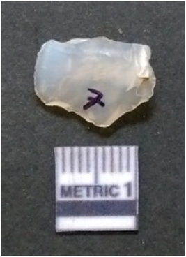 | Description / विवरण | The flake has irregular fracture pattern and sharp flaked edges as a result of lithic knapping activity. The piece is pale, with surface flake scars and a bulbous end. The quartz flake is glassy, and transparent. |