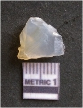 | Description / विवरण | The chalcedony flake is pale in color and translucent in appearance. The piece has s harp flaked ends and a bulbous end due to flaking. The flake has a crypto-crystalline silica matrix. |