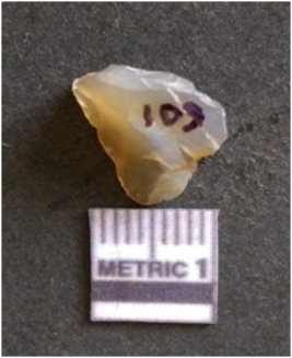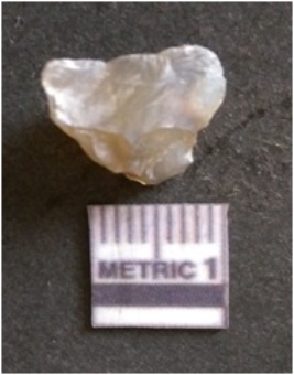 | Description / विवरण | The chalcedony flake is pale in color and translucent in appearance. The piece has s harp flaked ends and a bulbous end due to flaking. The flake has a crypto-crystalline silica matrix. |