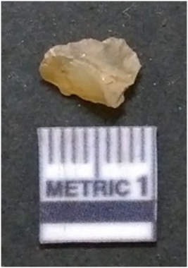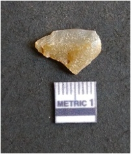 | Description / विवरण | The chalcedony flake is pale in color and translucent in appearance. The piece has s harp flaked ends and a bulbous end due to flaking. The flake has a crypto-crystalline silica matrix. |