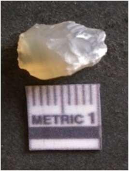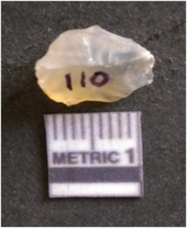 | Description / विवरण | The chalcedony flake is pale in color and translucent in appearance. The piece has s harp flaked ends and a bulbous end due to flaking. The flake has a crypto-crystalline silica matrix. |