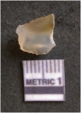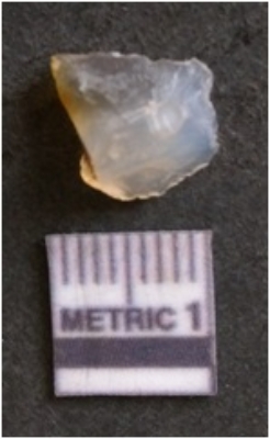 | Description / विवरण | The chalcedony flake is pale in color and translucent in appearance. The piece has s harp flaked ends and a bulbous end due to flaking. The flake has a crypto-crystalline silica matrix. |