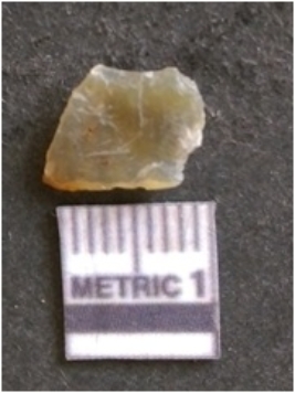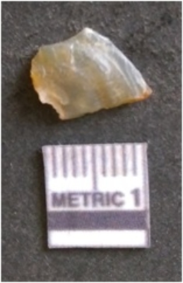 | Description / विवरण | The chalcedony flake is pale in color and translucent in appearance. The piece has s harp flaked ends and a bulbous end due to flaking. The flake has a crypto-crystalline silica matrix. |