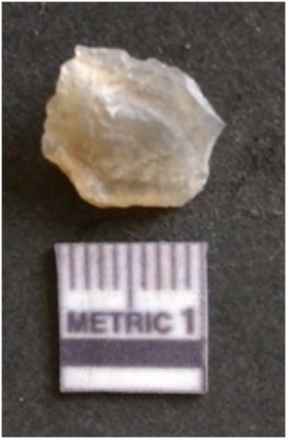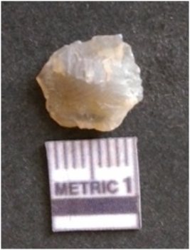 | Description / विवरण | The chalcedony flake is pale in color and translucent in appearance. The piece has s harp flaked ends and a bulbous end due to flaking. The flake has a crypto-crystalline silica matrix. |