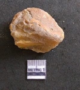 | Description / विवरण | It is a chalcedony flake, with a bulb of percussion on the ventral side. Cortex on one end. |