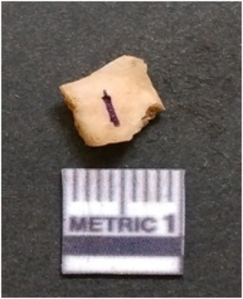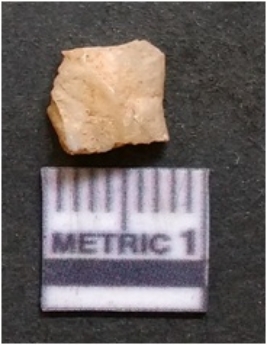 | Description / विवरण | The flake has irregular fracture pattern and sharp flaked edges as a result of lithic knapping activity. The piece is pale, with surface flake scars and a bulbous end. The quartz flake is glassy, and transparent. |