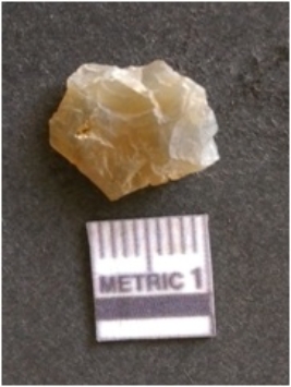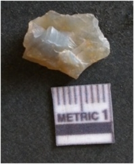 | Description / विवरण | The chalcedony flake is pale in color and translucent in appearance. The piece has s harp flaked ends and a bulbous end due to flaking. The flake has a crypto-crystalline silica matrix. |