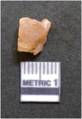 | Description / विवरण | The flake has irregular fracture pattern and sharp flaked edges as a result of lithic knapping activity. The piece is pale, with surface flake scars and a bulbous end. The quartz flake is glassy, and transparent. |