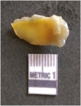 | Description / विवरण | The chalcedony flake is pale in color and translucent in appearance. The piece has s harp flaked ends and a bulbous end due to flaking. The flake has a crypto-crystalline silica matrix. |