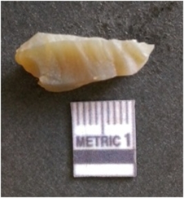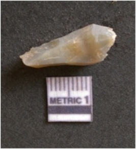 | Description / विवरण | The chalcedony flake is pale in color and translucent in appearance. The piece has s harp flaked ends and a bulbous end due to flaking. The flake has a crypto-crystalline silica matrix. |