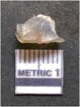 | Description / विवरण | The chalcedony flake is pale in color and translucent in appearance. The piece has s harp flaked ends and a bulbous end due to flaking. The flake has a crypto-crystalline silica matrix. |