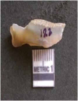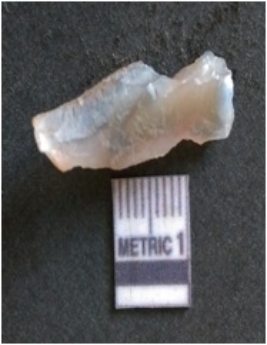 | Description / विवरण | The chalcedony flake is pale in color and translucent in appearance. The piece has s harp flaked ends and a bulbous end due to flaking. The flake has a crypto-crystalline silica matrix. |