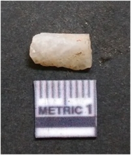 | Description / विवरण | The chalcedony flake is pale in color and translucent in appearance. The piece has s harp flaked ends and a bulbous end due to flaking. The flake has a crypto-crystalline silica matrix. |