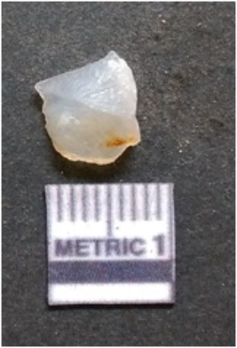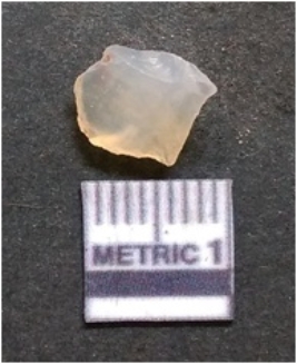 | Description / विवरण | The chalcedony flake is pale in color and translucent in appearance. The piece has s harp flaked ends and a bulbous end due to flaking. The flake has a crypto-crystalline silica matrix. |