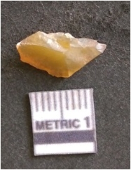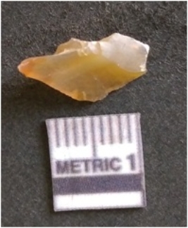 | Description / विवरण | The chalcedony flake is pale in color and translucent in appearance. The piece has s harp flaked ends and a bulbous end due to flaking. The flake has a crypto-crystalline silica matrix. |