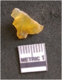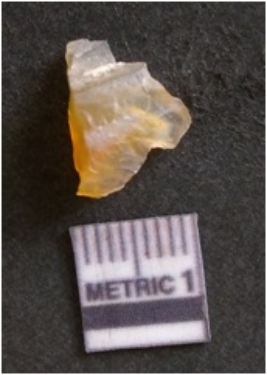 | Description / विवरण | The chalcedony flake is pale in color and translucent in appearance. The piece has s harp flaked ends and a bulbous end due to flaking. The flake has a crypto-crystalline silica matrix. |