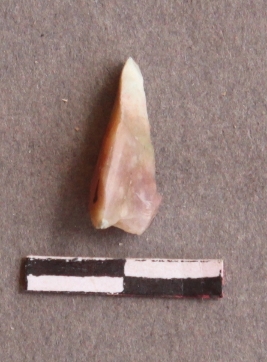 | Description / विवरण | It is a small and elongated fragment of pinkish quartz. It has sharp edges and pointed ends. Flake scars on the surface. |