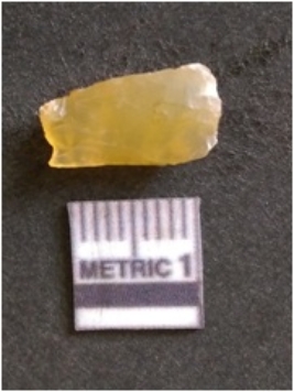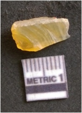 | Description / विवरण | The chalcedony flake is pale in color and translucent in appearance. The piece has s harp flaked ends and a bulbous end due to flaking. The flake has a crypto-crystalline silica matrix. |