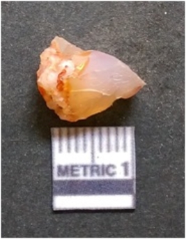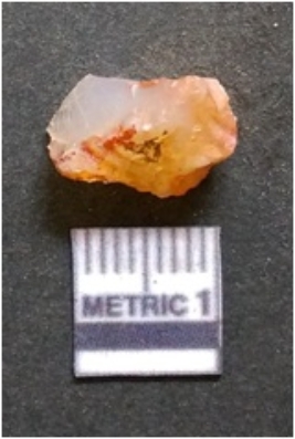 | Description / विवरण | The chalcedony flake is pale in color and translucent in appearance. The piece has s harp flaked ends and a bulbous end due to flaking. The flake has a crypto-crystalline silica matrix. |