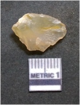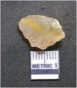| Description / विवरण | The chalcedony flake is pale in color and translucent in appearance. The piece has s harp flaked ends and a bulbous end due to flaking. The flake has a crypto-crystalline silica matrix. |