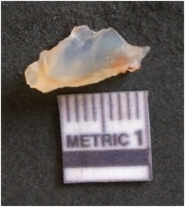 | Description / विवरण | The chalcedony flake is pale in color and translucent in appearance. The piece has s harp flaked ends and a bulbous end due to flaking. The flake has a crypto-crystalline silica matrix. |