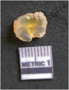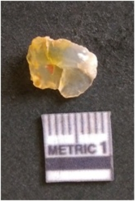 | Description / विवरण | The chalcedony flake is pale in color and translucent in appearance. The piece has s harp flaked ends and a bulbous end due to flaking. The flake has a crypto-crystalline silica matrix. |