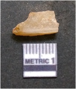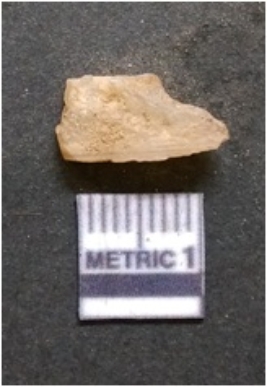 | Description / विवरण | The chalcedony flake is pale in color and translucent in appearance. The piece has s harp flaked ends and a bulbous end due to flaking. The flake has a crypto-crystalline silica matrix. |
