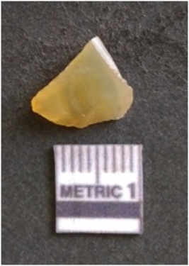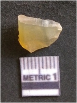 | Description / विवरण | The chalcedony flake is pale in color and translucent in appearance. The piece has s harp flaked ends and a bulbous end due to flaking. The flake has a crypto-crystalline silica matrix. |