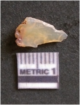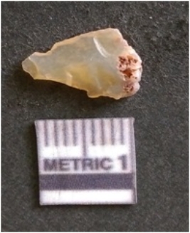 | Description / विवरण | The chalcedony flake is pale in color and translucent in appearance. The piece has s harp flaked ends and a bulbous end due to flaking. The flake has a crypto-crystalline silica matrix. |