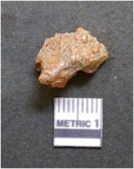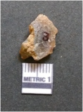 | Description / विवरण | The quartz flake has irregular fracture pattern and sharp flaked edges as a result of lithic knapping activity. The piece is pale, with surface flake scars and a bulbous end. The flake is of smoky quartz variety, grayish in color and translucent in appearance. |