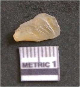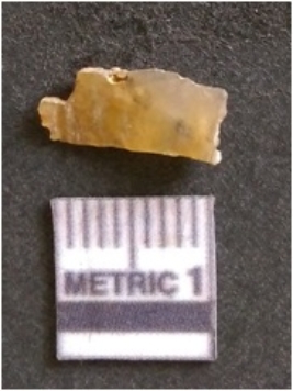 | Description / विवरण | The chalcedony flake is pale in color and translucent in appearance. The piece has s harp flaked ends and a bulbous end due to flaking. The flake has a crypto-crystalline silica matrix. |