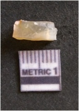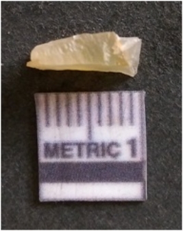 | Description / विवरण | The chalcedony flake is pale in color and translucent in appearance. The piece has s harp flaked ends and a bulbous end due to flaking. The flake has a crypto-crystalline silica matrix. |