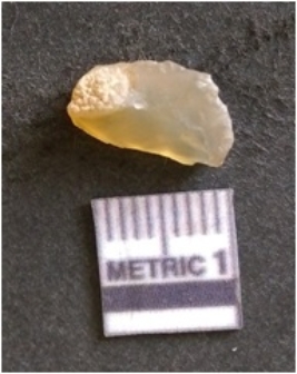 | Description / विवरण | The chalcedony flake is pale in color and translucent in appearance. The piece has s harp flaked ends and a bulbous end due to flaking. The flake has a crypto-crystalline silica matrix. |