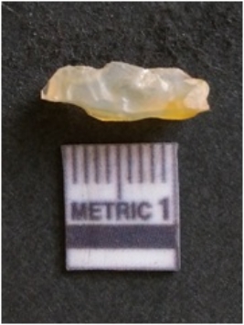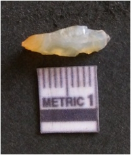 | Description / विवरण | The chalcedony flake is pale in color and translucent in appearance. The piece has s harp flaked ends and a bulbous end due to flaking. The flake has a crypto-crystalline silica matrix. |