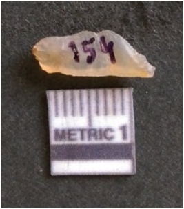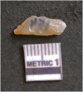 | Description / विवरण | The chalcedony flake is pale in color and translucent in appearance. The piece has s harp flaked ends and a bulbous end due to flaking. The flake has a crypto-crystalline silica matrix. |