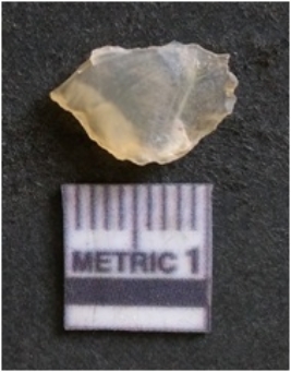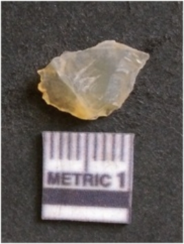 | Description / विवरण | The chalcedony flake is pale in color and translucent in appearance. The piece has s harp flaked ends and a bulbous end due to flaking. The flake has a crypto-crystalline silica matrix with yellow lint. |