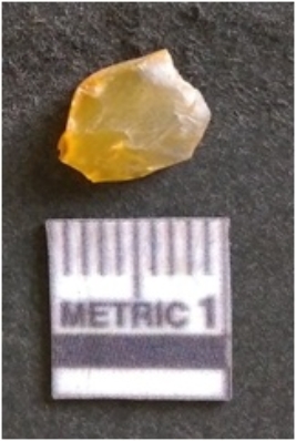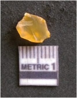 | Description / विवरण | The chalcedony flake is pale in color and translucent in appearance. The piece has s harp flaked ends and a bulbous end due to flaking. The flake has a crypto-crystalline silica matrix with yellow lint. |