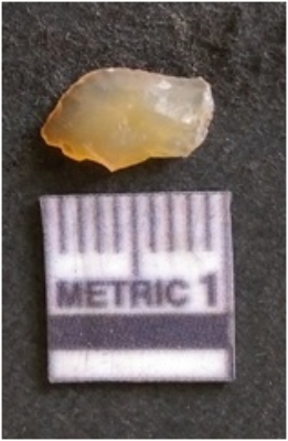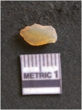 | Description / विवरण | The chalcedony flake is pale in color and translucent in appearance. The piece has s harp flaked ends and a bulbous end due to flaking. The flake has a crypto-crystalline silica matrix with yellow lint. |