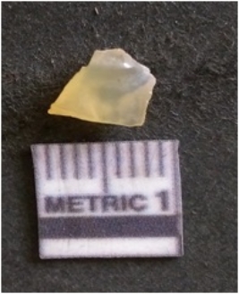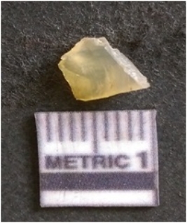 | Description / विवरण | The chalcedony flake is pale in color and translucent in appearance. The piece has s harp flaked ends and a bulbous end due to flaking. The flake has a crypto-crystalline silica matrix with yellow lint. |