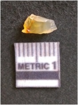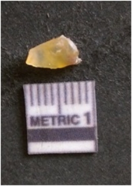 | Description / विवरण | The chalcedony flake is pale in color and translucent in appearance. The piece has s harp flaked ends and a bulbous end due to flaking. The flake has a crypto-crystalline silica matrix with yellow lint. |