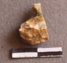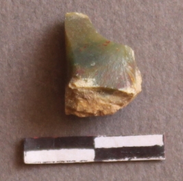 | Description / विवरण | It is a blood stone flake. Very cryptocrystalline. Flakes scar on the surface with ripples on it. Cortex on one end of the surface. |