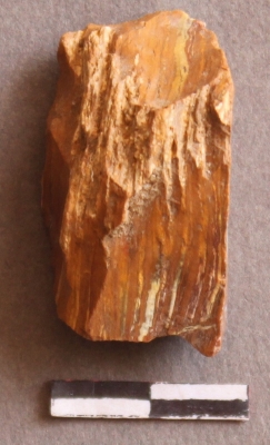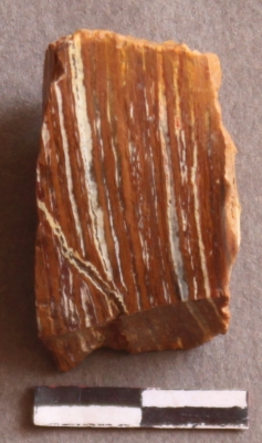 | Description / विवरण | It is a woody agate nodule. With bulb of percussion on ventral side of the fragment. Flake ridges on the surface. It is a banded agate and translucent in appearance. |
