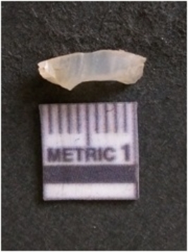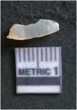 | Description / विवरण | The chalcedony flake is pale in color and translucent in appearance. The piece has s harp flaked ends and a bulbous end due to flaking. The flake has a crypto-crystalline silica matrix with translucent white in color. |