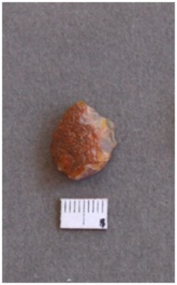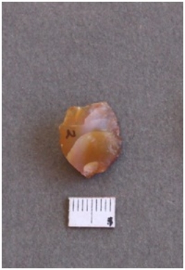 | Description / विवरण | Carnelian with bulb of percussion, translucent with internal bands. Cortex is visible on one side and ripple are seen. |